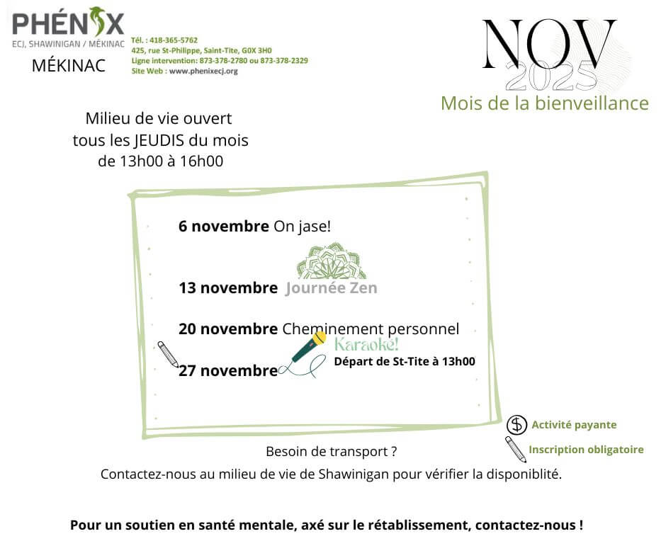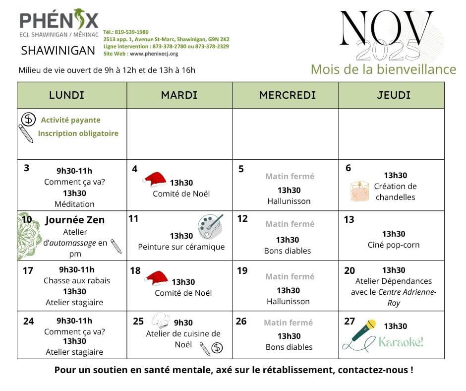 En novembre, les activités du Phénix ECJ Shawinigan / Mékinac sont placées sous le thème de la bienveillance. Pour ne rien manquer, suivez notre page Facebook : LePhenixECJ ou téléphonez-nous pour recevoir le calendrier du mois. Il est important de respecter les consignes d’inscription mentionnées sur le calendriers.